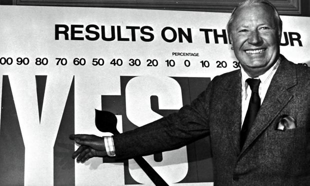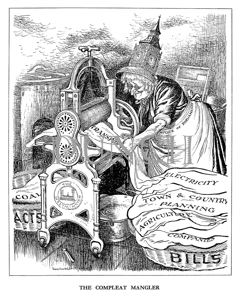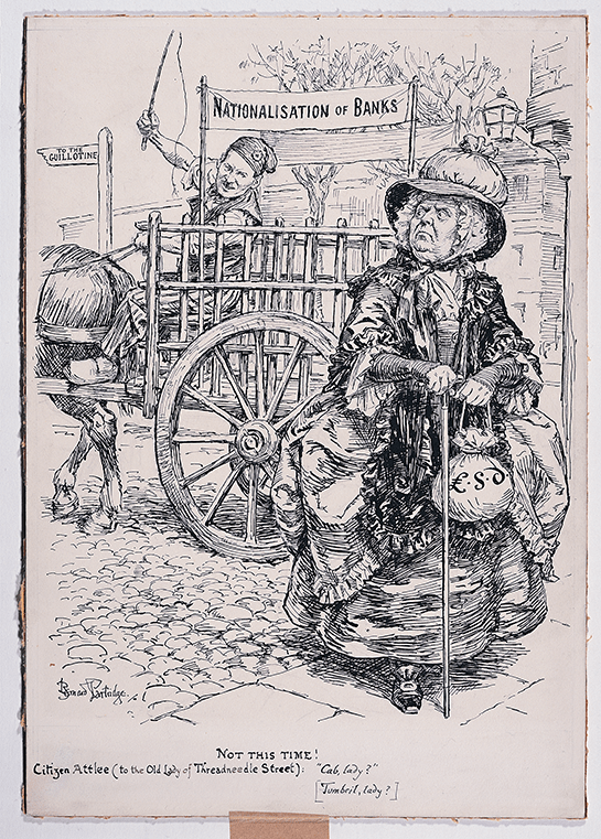 Cartŵn dychanol o 1935 yn portreadu Clement Attlee yn cynnig pas i Hen Wreigan Stryd Threadneedle, ar ei ffordd i’w dienyddio. Unarddeg mlynedd yn ddiweddarach caiff ei wireddu (ffynhonell)