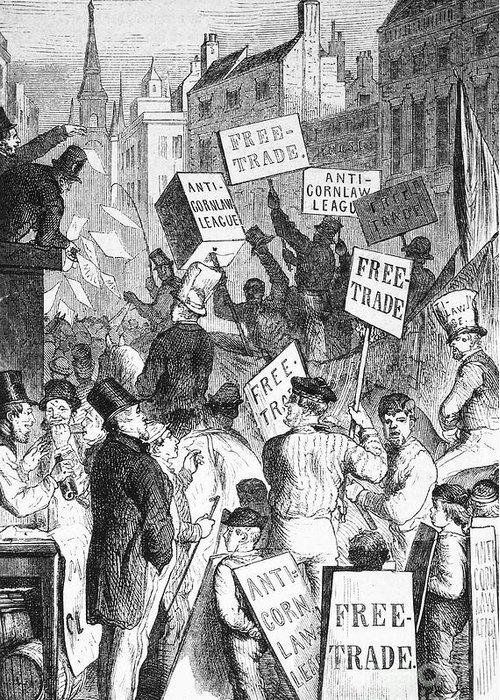 Yn ogystal, yn 1846 mae llywodraeth Geidwadol yn diddymu’r Deddfau Ŷd sy’n hollti’r Blaid a gorfodi ymddiswyddiad Peel, er mwyn masnachu’n rhydd a hybu llîf ariannol y Bunt Brydeinig i weddill y byd erbyn diwedd y Bedwaredd Ganrif ar Bymtheg, tra’n tanseilio’r hir dymor drwy redeg colledion masnachol efo’i ddau gystadleuwr rhyngwladol mwyaf, yr Almaen a’r Unol Daleithiau.