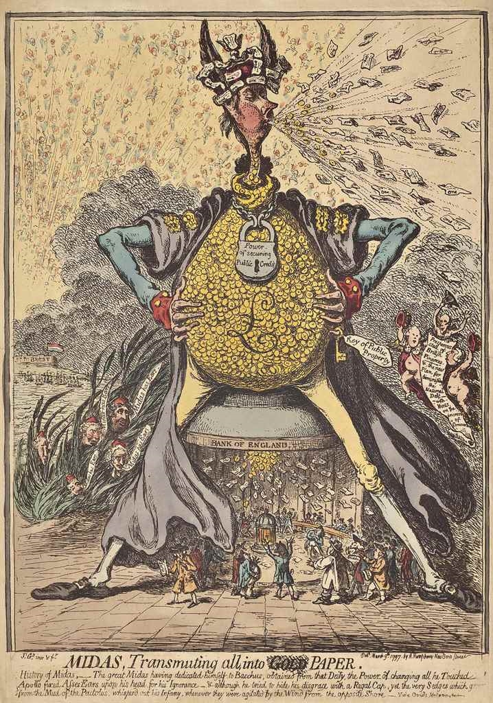 Y cartŵnydd dychanol James Gillray yn gwatwar Senedd Prydain dan Brif Weinidogaeth William Pitt yr Ieuengaf yn troi at wâsg argraffu cyfred papur i ariannu rhyfeloedd truenus yr Ymerodraeth (ffynhonell)
