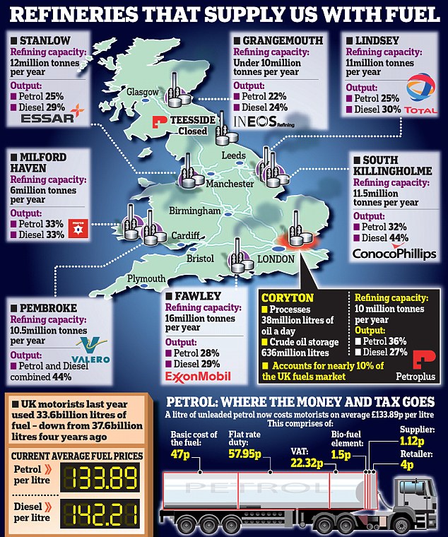 Meirinfeydd olew Prydain yn 2012. Mae safle Aberdaugleddau wedi cau a safle Penfro dal yn agored, felly o leiaf mae gan Gymru un safle sy’n cynhyrchu tanwydd gartref (ffynhonell)