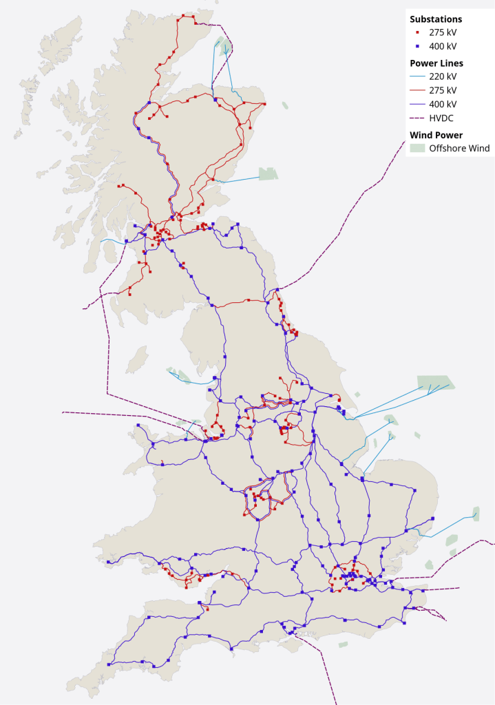 Grid Trydanol Cenedlaethol Prydain, sy’n gadael i bŵerdai trydanol blwgio fewn, a’i drawsyru i’r rhwydwaith dosbarthu ar gyfer defnyddwyr trydan blwgio allan (ffynhonell)