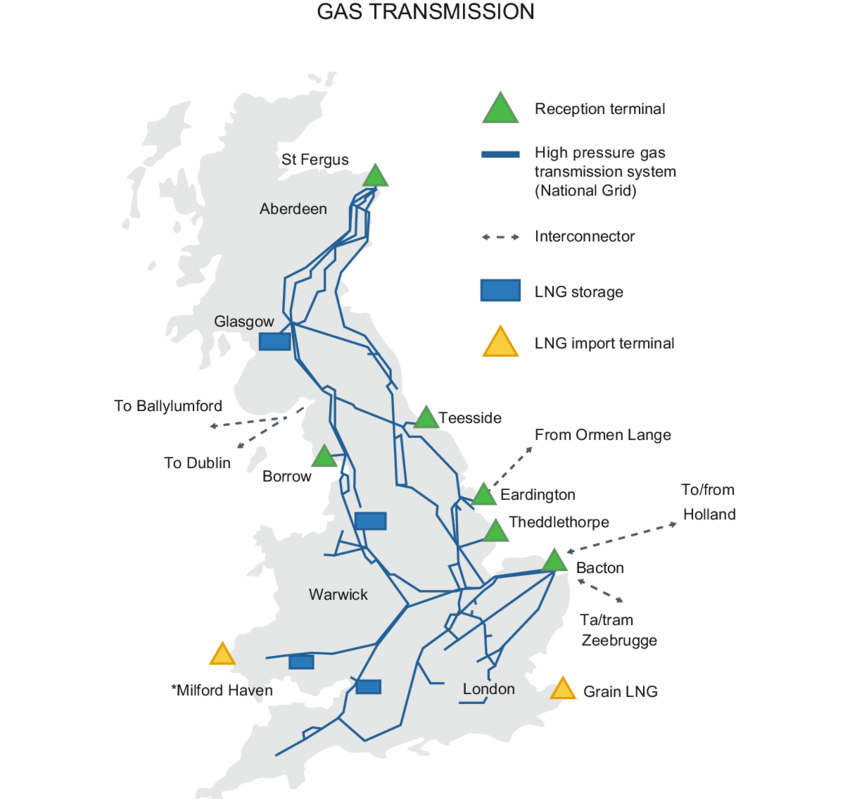 Mae nwy, fel trydan, angen rhwydwaith trawsyru i gysylltu defnyddwyr nwy Prydain, mae porthladd Aberdaugleddau yn derfynfa bwysig ar gyfer mewnforion ag allforion nwy ar longau (ffynhonell)