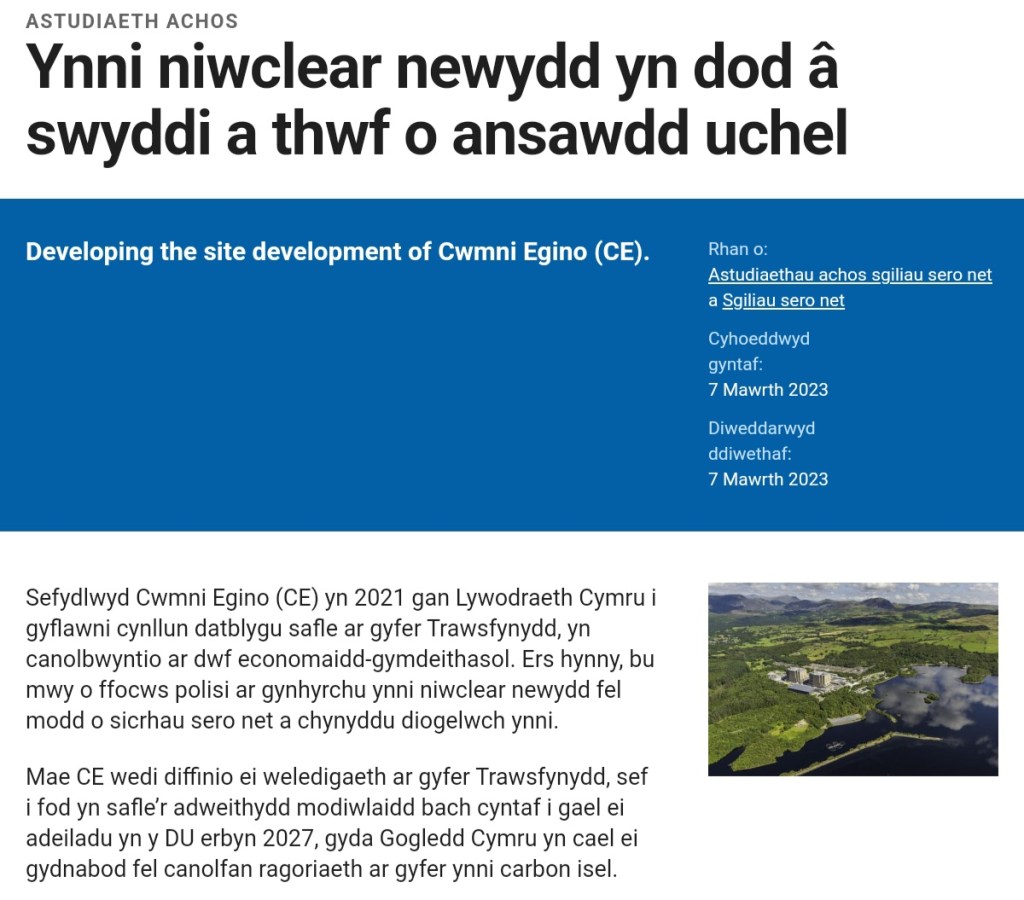 Mae hanes niwclear Cymru yn y Gogledd, efo Pŵerdy Trawsfynydd ers 1965, a Wylfa ers 1971 (ffynhonell)