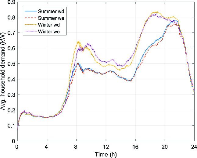 Galw Trydanol dros oriau’r dydd, a dros y tymhorau. Mae defnydd ansefydlog yn codi gwerth gorsafoedd pwmp hydro (ffynhonell)