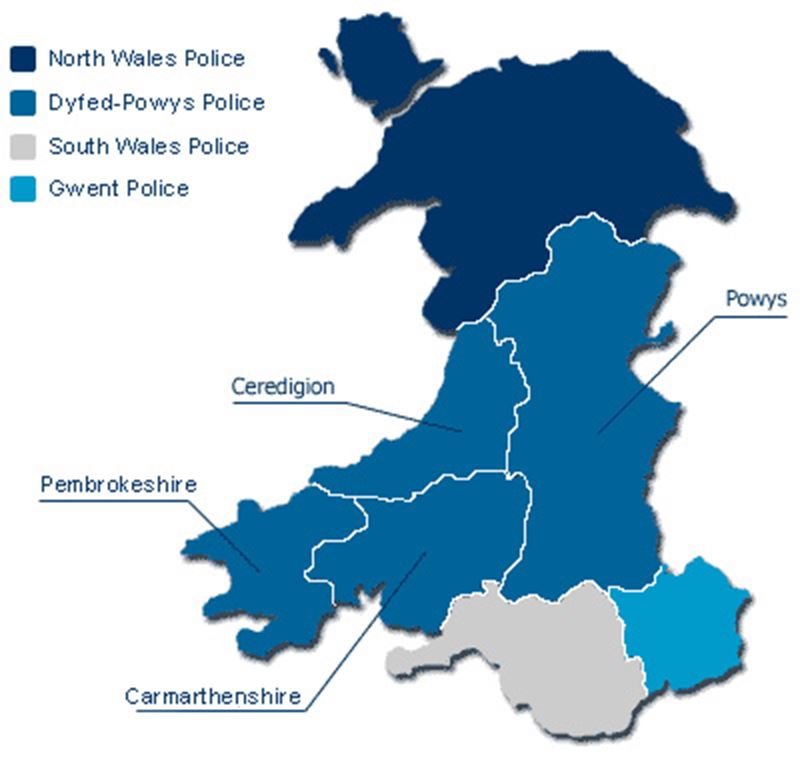 Pedair rhanbarth heddluol Cymru (ffynhonell)