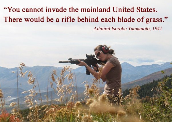 Dyfyniad sy’n gael ei briodoli i Lyngesydd Isoroku Yamamoto ar unryw strategaeth gan Ymerodraeth Siapan i oresgyn yr Unol Daleithiau yn ystod yr Ail Ryfel Byd, oherwydd yr Ail Amendiad (ffynhonell)