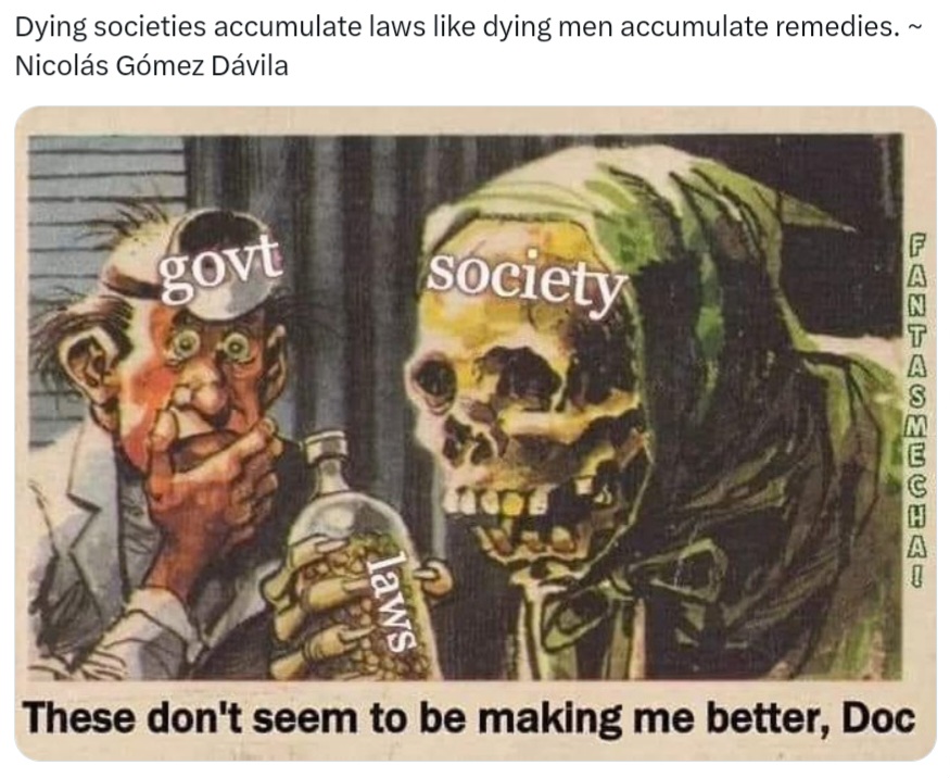 Medrir dadlau fod y Wladwriaeth Lês eisioes yn ynghynaladwy gyda gofynion mwy o ddibynwyr ar lai o gynhyrchwyr, sydd yn rhan o’r dymchwel mewn demograffeg sy’n geni llai o blant ar gyfer talu fewn i’r sgam gyfundrefn yn y dyfodol, fydd ond yn cyflymu ei ddarfod. Wrth i’r cenedlaethau ifanc sylweddoli na fyddant yn derbyn pensiynau gwladol a gwasanaeth iechyd dibynadwy mewn cyfnewid am eu taliadau Yswiriant Gwladol, byddant yn gynyddol yn ei osgoi’n gyfangwbwl drwy fabwysiadu Bitcoin (ffynhonell)