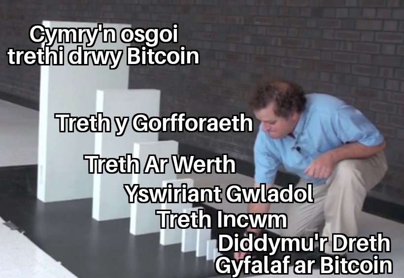 Mae’r uchod wrth gwrs ymhell yn y dyfodol am yn awr, yn bresennol mae gafael Senedd a Banciau Llundain efo dwy law rownd ein gwddw, yn chwyddo, trethu a rheolaethu’r Undeb fewn i ddymchweliad dinistriol, tra mae gwerth Bitcoin er yn chwyddo dros y blynyddoedd yn ansefydlog ar gyfer defnydd dydd i dydd, yn erbyn gwerth sefydlog dydd i ddydd y Bunt er ei ddibrisio parhaol dros y blynyddoedd. Mae’r duedd a’r broses o drawsnewid Cymru o fesur efo Punt Llundain i fesur mewn Bitcoin yn mynd i gymeryd y Ddegawd nesaf o leiaf, angladd a genedigaeth ar y tro.